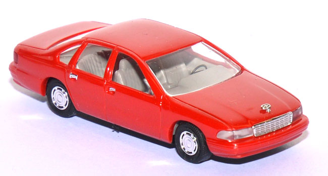 Chevrolet Caprice Baujahr 1994/95. Modell-Details: Verchromte Felgen, eingesetzte und verchromte Türgriffen, eingesetzte Scheinwerfer und Rückleuchten. 1991 hat sich General Motors wieder den traditionellen großen amerikanischen Automobil mit Heckantrieb zugewendet. Der 91er Caprice besaß das verbreiterte Chassis der 90er Modells und eine völlig neue Karosserie, was einen deutlich verbesserten Cw-Wert bedeutete (0,33 statt 0,41). Der Chevrolet Caprice Classic aus dem Jahre 1995 beeindruckt mit seinen Abmessungen von 5,44 m Länge, 1,96 m Breite, 578 l Kofferraumvolumen etc. Serienmäßig in der Basisversion hatte der Caprice eine 5 Liter V8-Maschine mit 175 PS. (Quelle: Busch)
