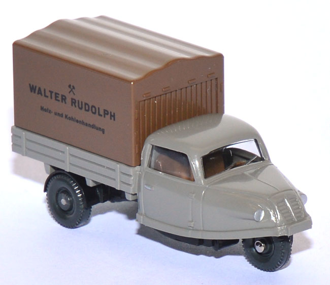 Fahrerhaus mit Pritsche in Steingrau, Fahrgestell in Schwarz, Plane in Blassbraun. Planenbedruckung mit Schriftzug “Walter Rudolph – Holz- und Kohlenhandlung“ (Quelle: Wiking)