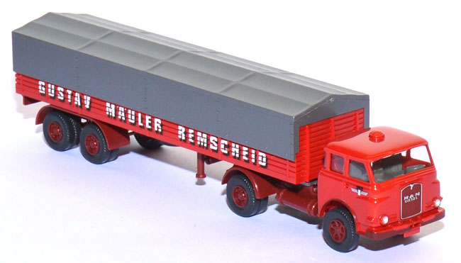 Zwei Jahre nach dem Höhepunkt der Weltwirtschaftskrise hatte sich Gustav Mäuler 1934 mit einer kleinen Transportfirma selbstständig gemacht. Und nach dem Krieg erhielt seine Gründerstimmung nochmals einen Schub, Mäuler schwor seinen Fuhrpark vehement auf MAN ein. Die Frontlenkergeneration der kleinen und großen Pausbacke hatten bei Mäuler ein Stein im Brett und sollten im Vergleich zu den Mercedes-Benz-Fahrzeugen seines Unternehmens deutlich in der Überzahl sein. So erinnert WIKING mit dem Pritschensattelzug an ein familiengeführtes Speditionsunternehmen, das durch das Engagement des Remscheider Gründers bis heute seine Leistungsfähigkeit bewahrte.(Quelle: Wiking)