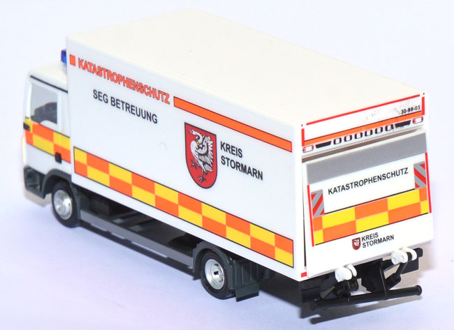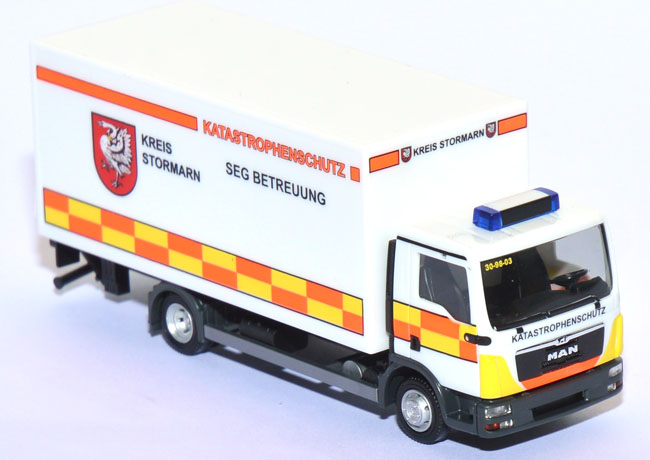 In Stormarn unweit von Hamburg wird dieser MAN TGL mit Kofferaufbau und Ladebordwand beim Katastrophenschutz eingesetzt. Die besondere Gestaltung mit dem dominanten Wappen des Landkreis Stormarn macht auch das Herpa-Modell zu einem Highlight. (Quelle: Herpa)