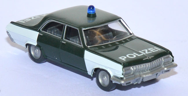 Von 1964 bis 1968 fuhr der Opel Kapitän A bereits in zukunftsweisender Bicolorgestaltung im hessischen Polizeidienst. Die hoheitliche Einsatzflotte setzte verständlicherweise vornehmlich auf Opel, um dem bundeslandbezogenen Rüsselsheimer Großarbeitgeber entgegen zu kommen. Den Beamten im Cockpit des Opel Kapitän A war angesichts der amerikanischen Straßenkreuzer-Anmutung bis weit in die späten 1960er-Jahre ein imposanter Auftritt auf hessischen Straßen vergönnt. Dass die hessische Polizei den benachbarten Bundesländern in Optik und Design weit voraus war, belegte allein schon die Tatsache, dass zeitgleich mit der Indienststellung des schnittigen Opel Kapitän A in Bayern noch die Barockengel von BMW unterwegs waren. (Quelle: Wiking)