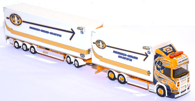 Angelehnt an das bekannte Design von ASG hat sich Micke Malmberg diesen Schwedenzug lackieren lassen und weicht somit vom eigentlich violetten Design von Malmberg aus Visby (Gotland, Schweden) ab. Mit der auffälligen Lackierung der Fahrerkabine rangiert das Original in den Top 10 der Nordic Trophy und hat bereits zahlreiche Auszeichnungen eingefahren. (Quelle: Herpa)