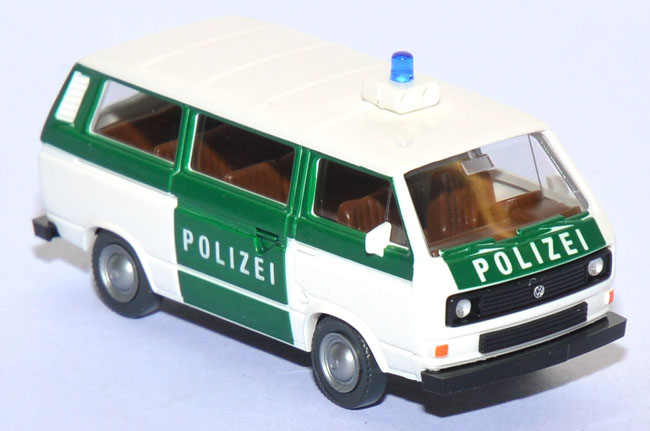 Nachdem der VW T2 sich in Polizeidiensten der Landesbehörden als unverzichtbar erwiesen hatte, machte sich 1979 auch der Generationswechsel zum T3 rasch im hoheitlichen Einsatz bemerkbar. Die zum Ende der 1970er-Jahre forcierte zweifarbige Gestaltung der Einsatzfahrzeuge wurde folgerichtig – und wie beim WIKING-Modell miniaturisiert – auch bei der dritten Bulli-Generation adaptiert. Damit prägte der VW T3 anders als die Pkw-Streifenwagen die Palette der Einsatzfahrzeuge über alle Bundesländer hinweg und wurde damit Wegbegleiter des bundesdeutschen Straßenbildes der 1980er-Jahre. Der T3 wurde von 1979 bis 1992 produziert und war zugleich die letzte Transporter-Baureihe mit Heckmotor und -antrieb. (Quelle: Wiking)